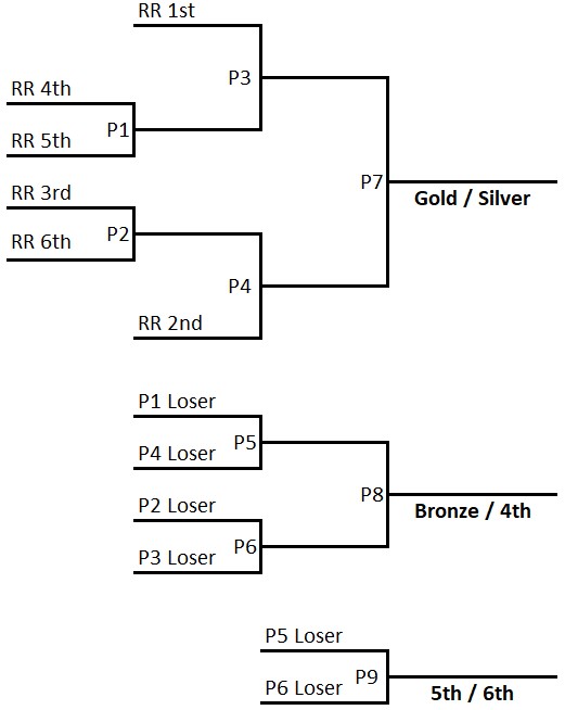 | Playoffs – Single Elimination with Gold x 2, Consolation and Placement | ||||